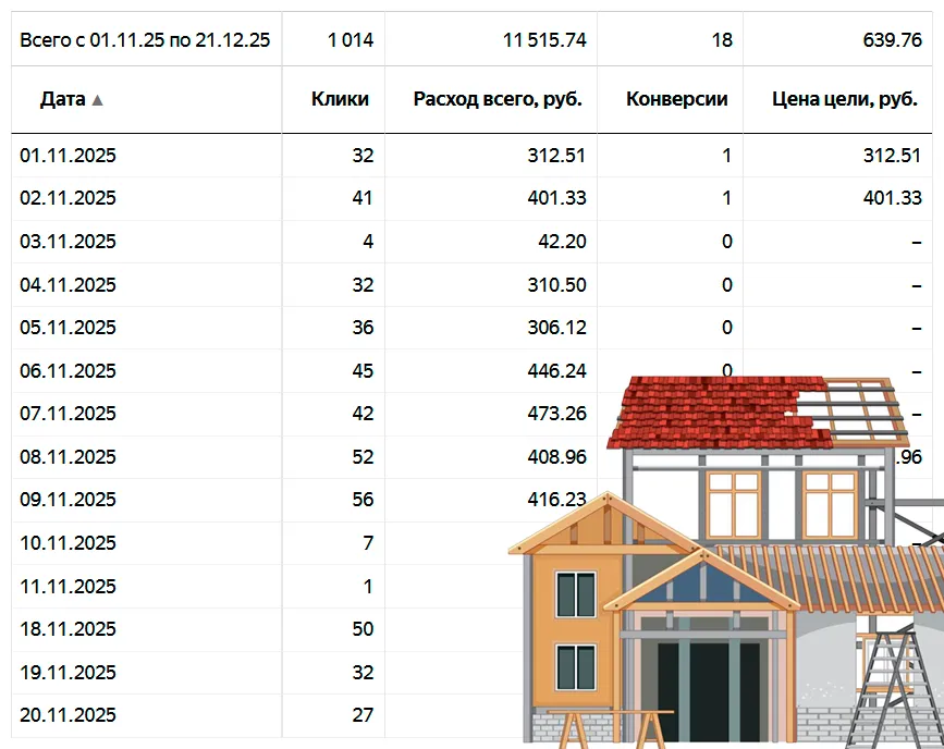 Некоторые строительные направления и их показатели рекламы за недавний период 2025 года. Могу быть максимально полезным в рекламе стройки: кровли, пристройки, крыши, фасады, реконструкция и строительство домов, фундаменты и другие направления!